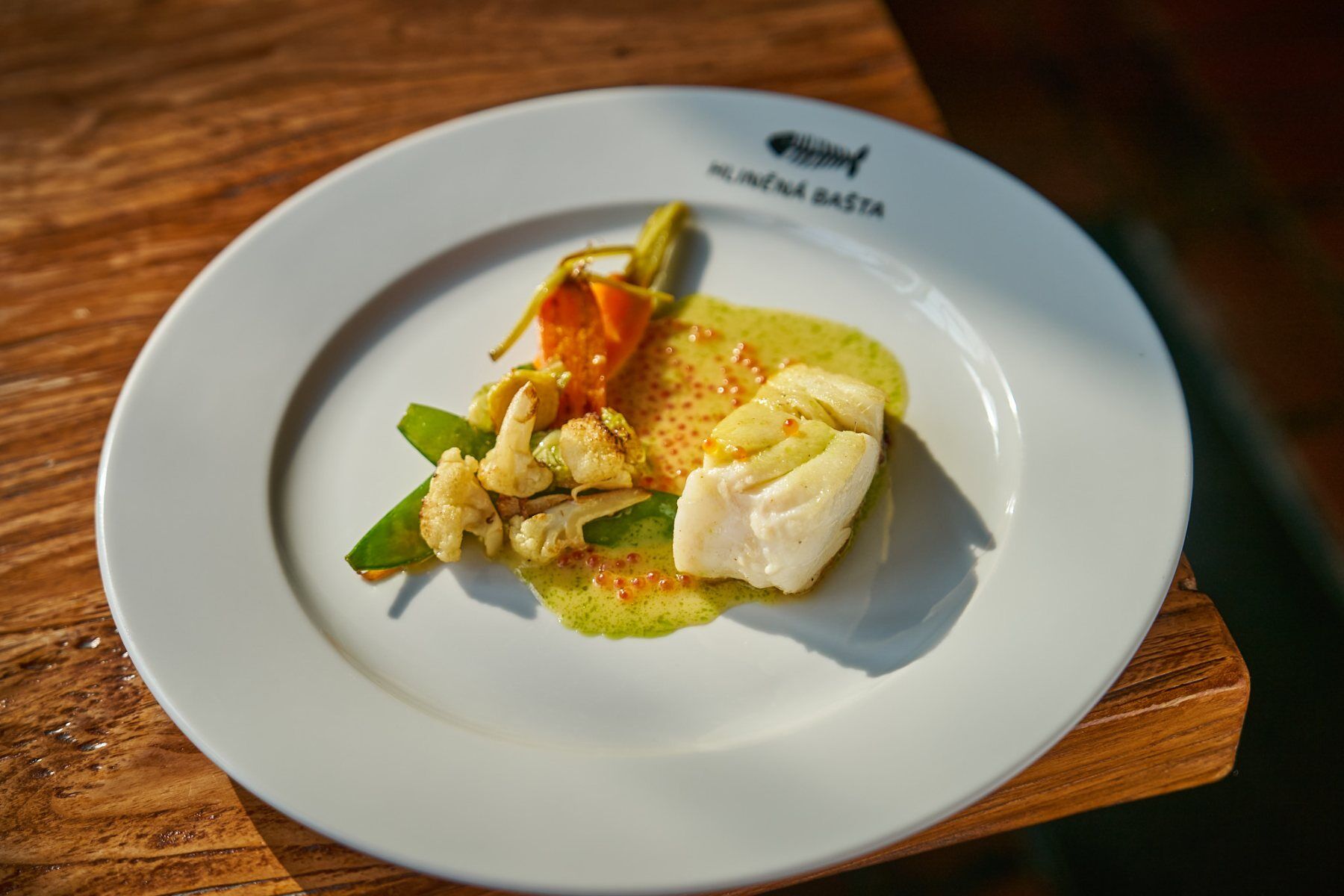 Grilled Arctic cod Skrei with white wine and buttermilk sauce, roasted vegetables and dill oil